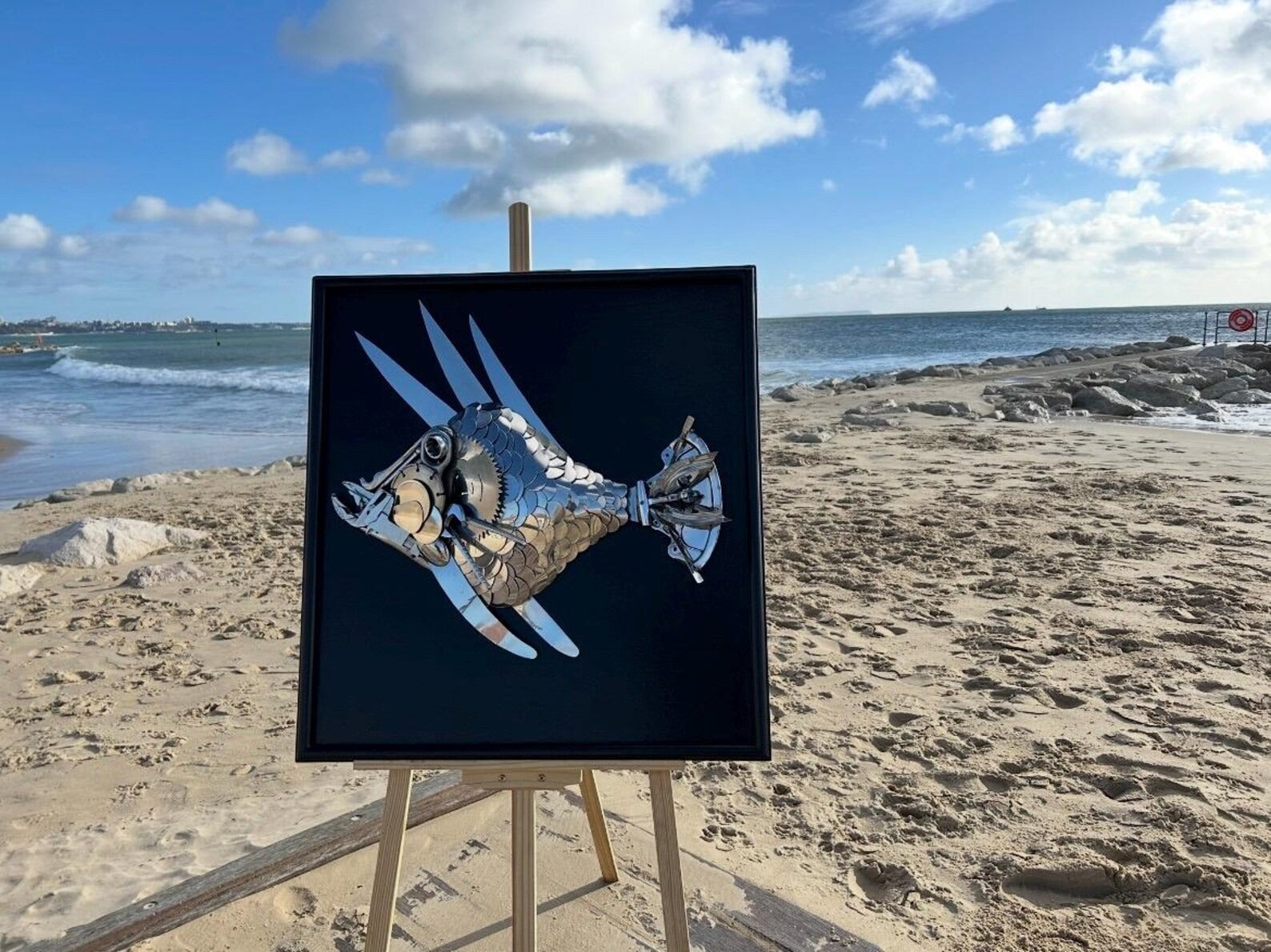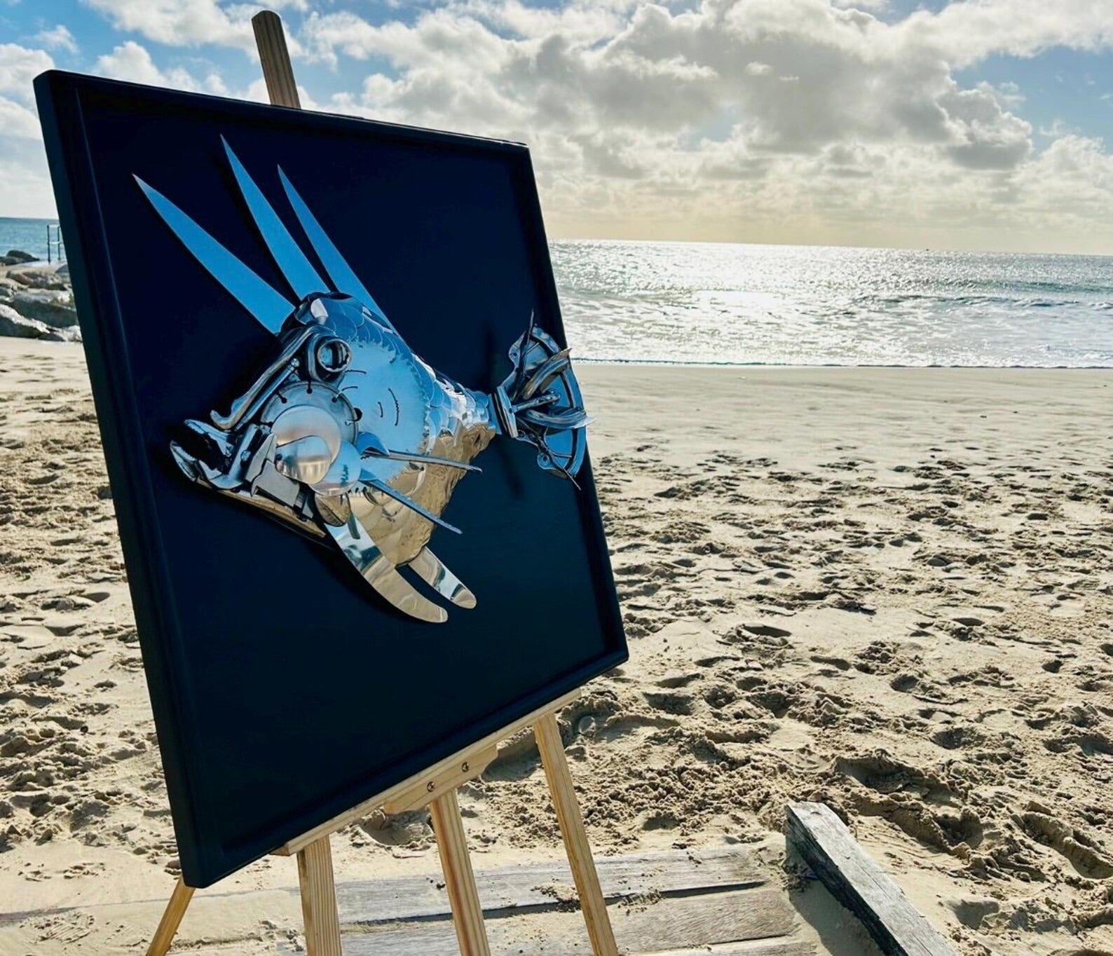 Each piece is lovingly crafted from reclaimed scrap materials combined with polished stainless steel, creating a stunning contrast between rustic textures and modern shine. Set within a classic photo frame, this artwork becomes a statement piece that celebrates creativity, sustainability, and the timeless beauty of the ocean.