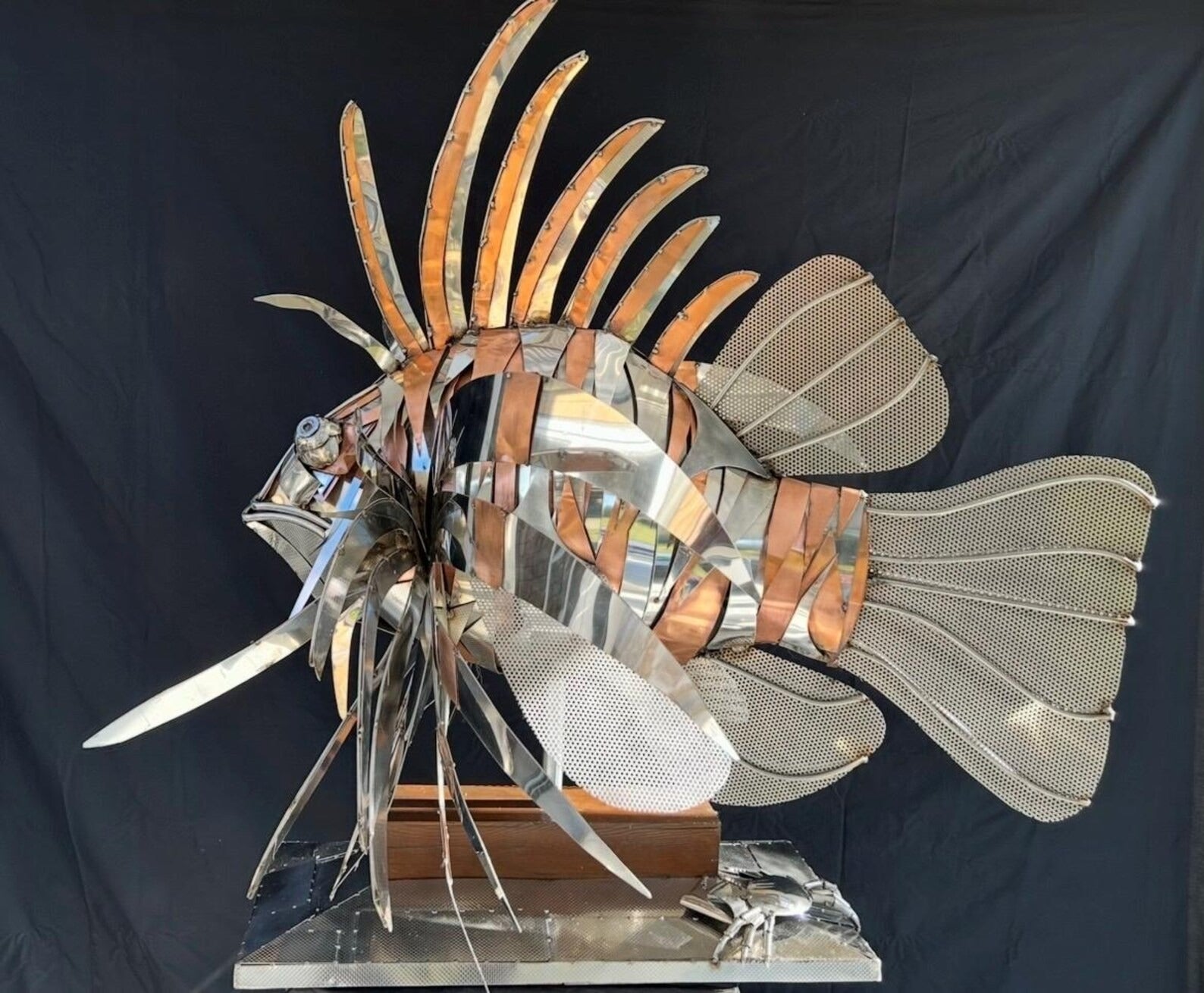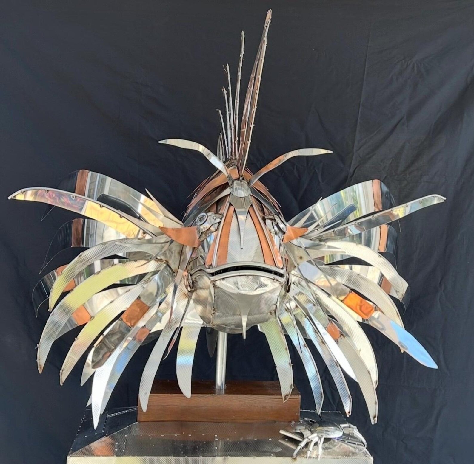 Stainless Steel and Copper Extra Large Lion Fish Sculpture With Cheeky Crab