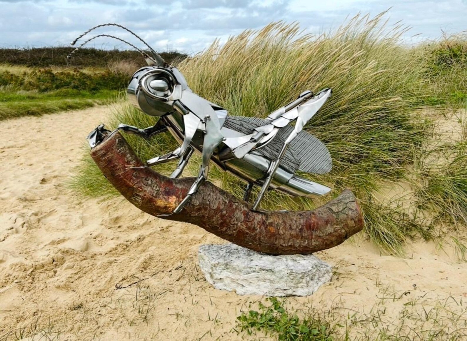 ‘Blade’ stainless steel grasshopper sculpture mounted on a pine and stone base.